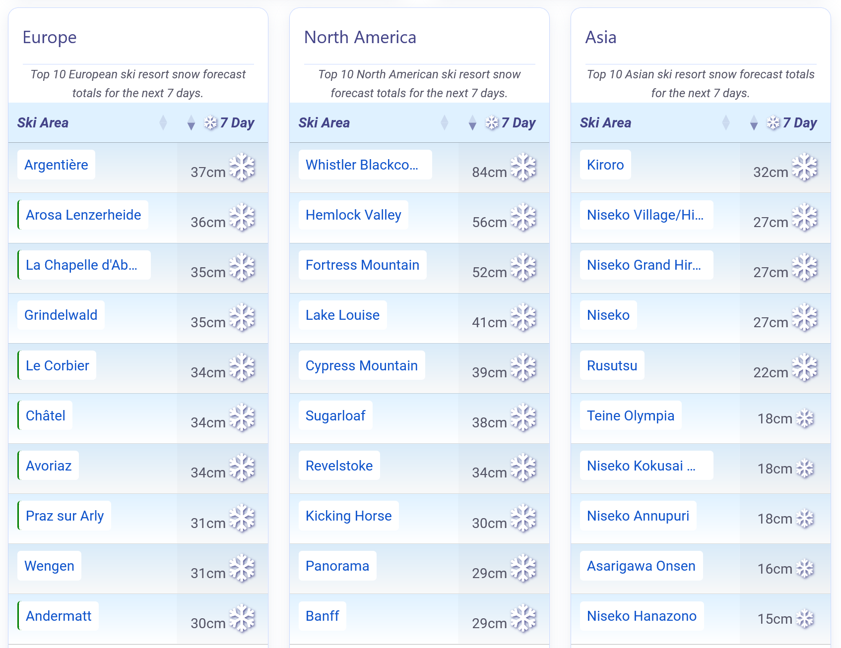 Snow forecast for the Alps, America and Japan.