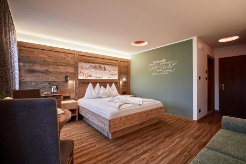 Featuring wooden floors and alpine-style wood furniture, this room includes a recently renovated bathroom. The large balcony has a table with chairs, a parasol and 2 deckchairs. Overlooks the Sciliar mountain range. This room can accommodate 1 extra person in the sofa bed or in a single bed.
