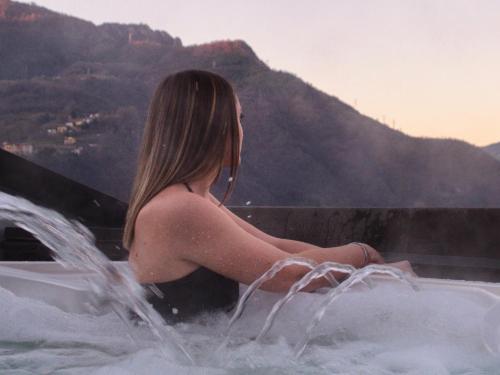 The B&B double room with relaxation area occupies the entire second floor of the structure with rustic furniture, parquet flooring, authentic Persian carpets, terrace with excellent views of the Brembana Valley. Bathroom with large corner bathtub (250 litres). Included in the price is exclusive entry for two people to the relaxation area (when booking it is mandatory to select the entry time slot: 2.30/4.20pm - 5.30pm/7.20pm - 8.30pm/10.00pm and accept the internal regulations). Aperitif, 30-minute holistic massage per person, hay bath and honey, red fruit or chestnut bath are available with a supplement to be paid on site.
